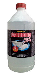 «САНЛЮКС» — универсальное средство для удаления минеральных отложений с поверхностей раковин, ванн, унитазов и другой сантехники (в том числе на полимерной основе), кафеля, металлов, искусственного и натурального камня, мытья стен и полов контактным способом с бактерицидным эффектом.